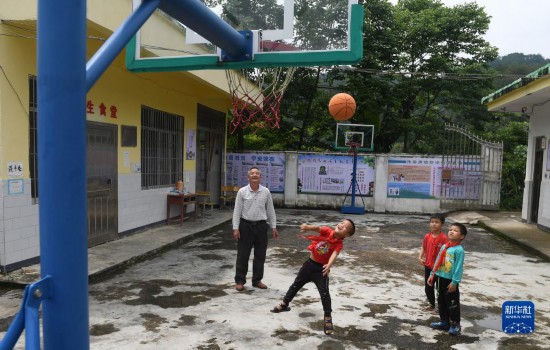 在廣西賀州市昭平縣五將鎮(zhèn)良風(fēng)村小學(xué)沖尾教學(xué)點,龔壽新老師和學(xué)生一起打球(5月25日攝)。