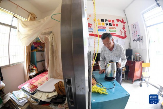 在廣西賀州市昭平縣五將鎮(zhèn)良風(fēng)村小學(xué)沖尾教學(xué)點,龔壽新老師在辦公室燒開水,辦公室一牆之隔是他的臥室(5月25日攝)。