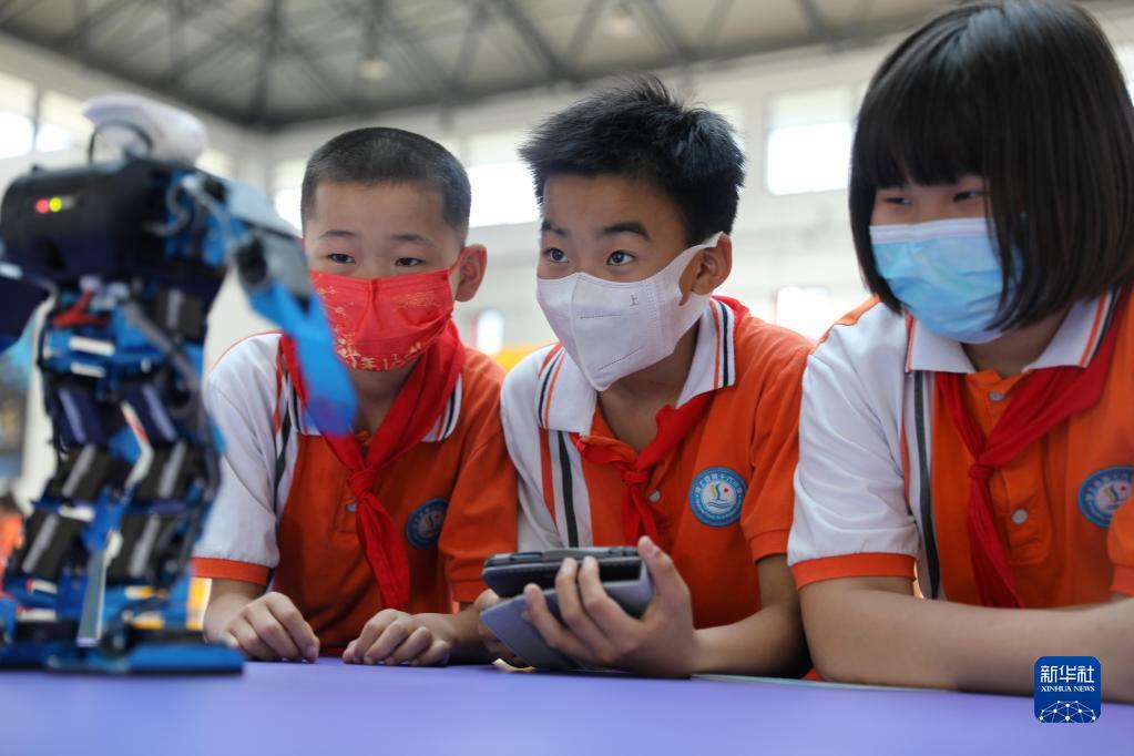 5月26日,潁上縣第十六小學(xué)學(xué)生在操控機(jī)器人。