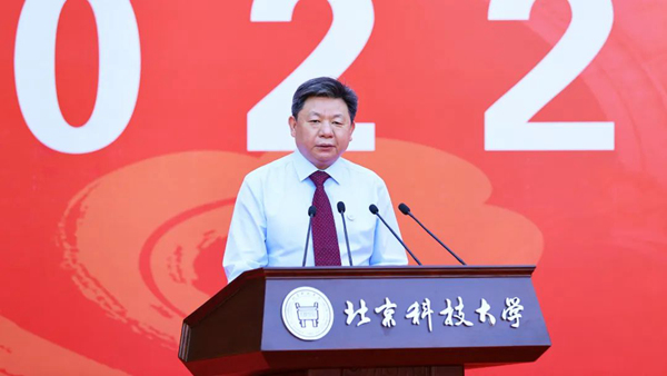 北京科技大學(xué)校長楊仁樹在2022屆學(xué)生畢業(yè)典禮上講話。校方供圖
