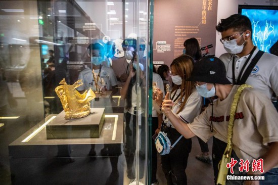 7月14日,“文化中國·錦繡四川——高校外籍師生巴蜀文化品悟之旅”活動走進四川德陽市綿竹年畫村、廣漢三星堆博物館。來自四川13所高校的26個國家的48名外籍師生在綿竹年畫村提筆繪制年畫,體驗中國非物質文化魅力﹔在廣漢三星堆博物館,外籍師生們了解三星堆遺址考古挖掘和保護過程,近距離接觸青銅神樹、青銅大立人像等珍貴文物,通過開三星堆文物盲盒的方式,體驗挖掘文物過程,感知古蜀文明的獨特魅力。圖為三星堆博物館金面具吸引外籍師生。 劉忠俊 攝