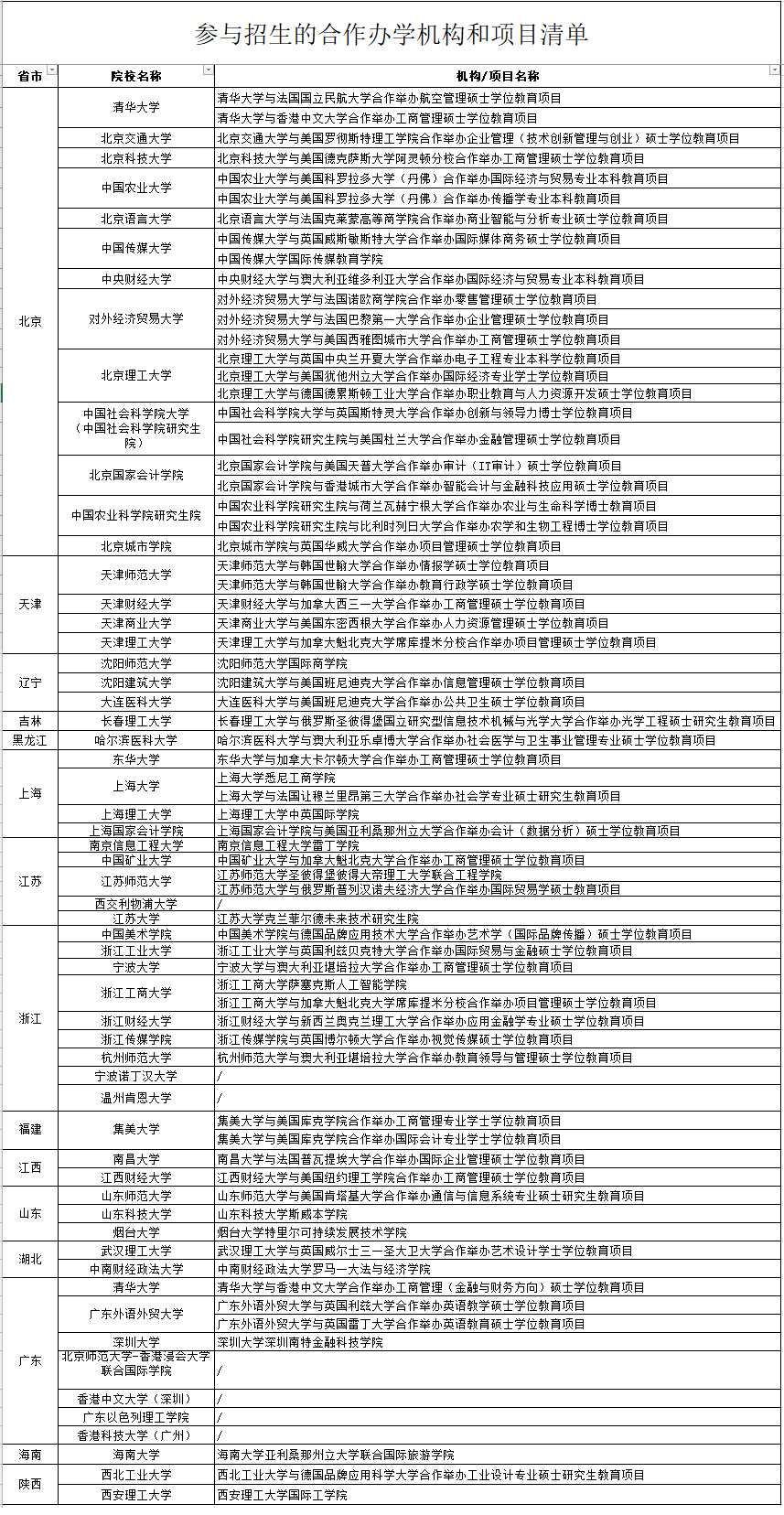 參與招生的合作辦學(xué)機構(gòu)和項目清單如下: