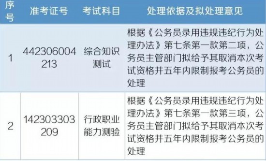 這其中,73名考生存在違規(guī)違紀(jì)行為或被認(rèn)定為雷同答卷考生,擬給予其“當(dāng)次該科目考試成績?yōu)榱惴值奶幚怼暴r2名考生被認(rèn)定違規(guī)違紀(jì),擬給予其取消本次考試資格並五年內(nèi)限制報考公務(wù)員的處理。