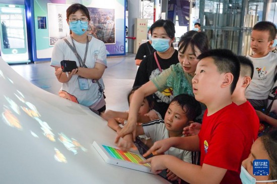 小朋友們和家人一起在南京科技館參觀(8月6日攝)。