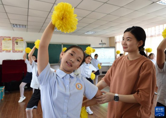 8月11日,在合肥市蜀新苑小學暑期托管班裡,學生在老師指導下學習啦啦操。