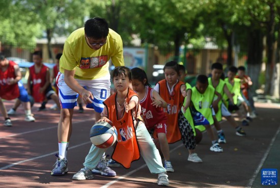 8月11日,在合肥市蜀新苑小學(xué)暑期托管班裡,學(xué)生在老師指導(dǎo)下學(xué)習(xí)籃球。