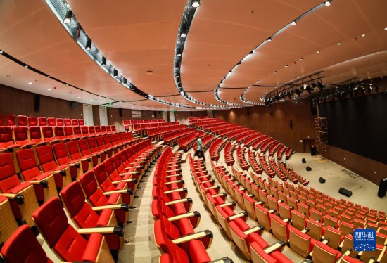 建設(shè)者在香港科技大學(xué)(廣州)報(bào)告廳內(nèi)檢查設(shè)備(8月16日攝)。