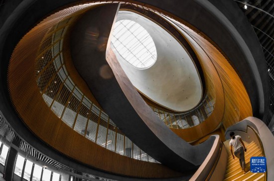 一名工作人員行走在香港科技大學(xué)(廣州)圖書館的樓梯上(8月16日攝)。