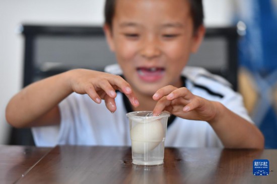 8月17日,在湘潭市雨湖區(qū)窯灣街道唐興寺社區(qū),小朋友在做“浮起來的雞蛋” 科學(xué)小實驗。