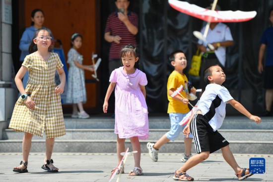 8月17日,在湘潭市雨湖區(qū)窯灣街道唐興寺社區(qū),小朋友在試飛自己制作的航模。