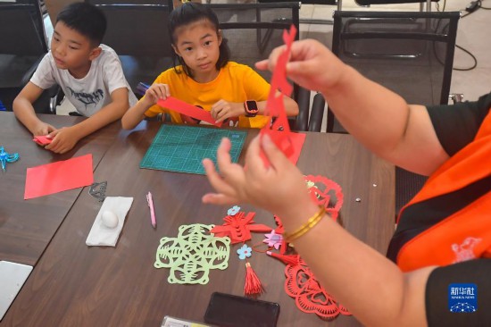 8月17日,在湘潭市雨湖區(qū)窯灣街道唐興寺社區(qū),小朋友在聽志願者講解剪紙的技巧。