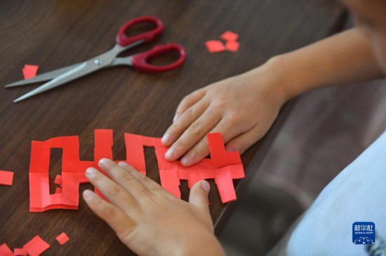 8月17日,在湘潭市雨湖區(qū)窯灣街道唐興寺社區(qū),小朋友在體驗(yàn)剪紙。