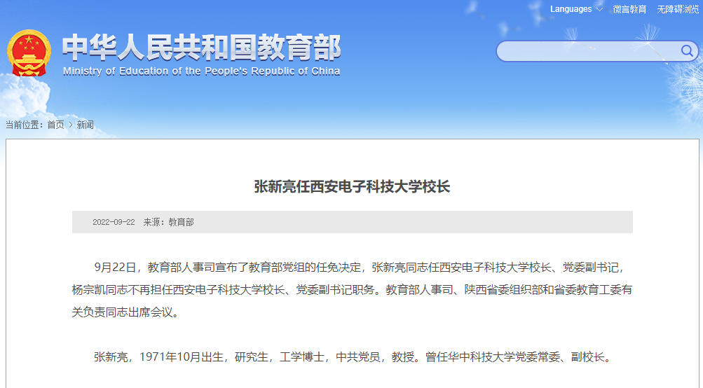 人民網(wǎng)北京9月22日電 (記者何淼)教育部人事司今日宣布了教育部黨組的任免決定,張新亮同志任西安電子科技大學(xué)校長、黨委副書記,楊宗凱同志不再擔(dān)任西安電子科技大學(xué)校長、黨委副書記職務(wù)。教育部人事司、陝西省委組織部和省委教育工委有關(guān)負(fù)責(zé)同志出席會議。