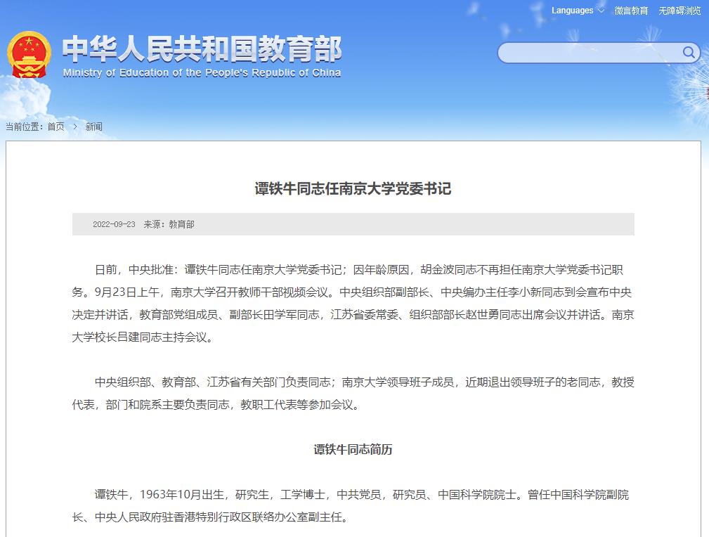 人民網(wǎng)北京9月23日電 據(jù)教育部網(wǎng)站消息,日前,中央批準(zhǔn):譚鐵牛同志任南京大學(xué)黨委書記﹔因年齡原因,胡金波同志不再擔(dān)任南京大學(xué)黨委書記職務(wù)。9月23日上午,南京大學(xué)召開教師干部視頻會議。中央組織部副部長、中央編辦主任李小新同志到會宣布中央決定並講話,教育部黨組成員、副部長田學(xué)軍同志,江蘇省委常委、組織部部長趙世勇同志出席會議並講話。南京大學(xué)校長呂建同志主持會議。