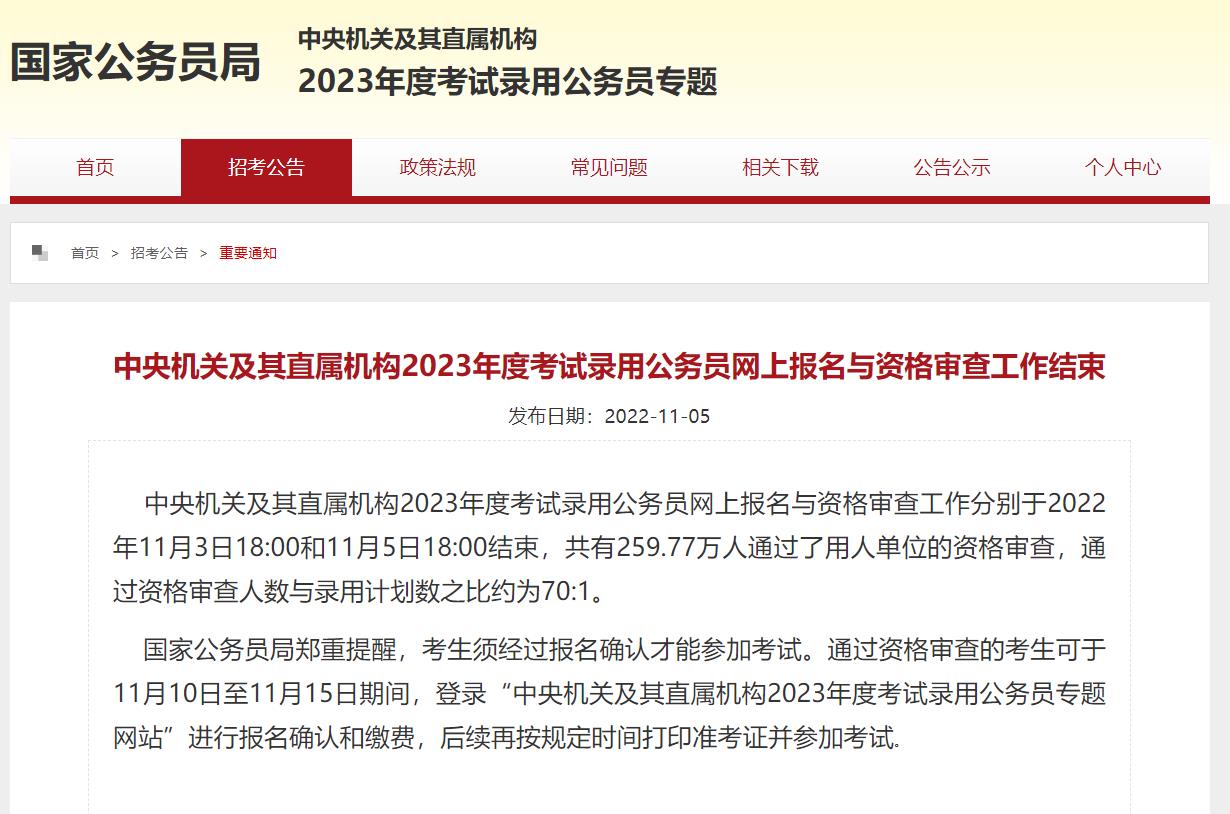 人民網(wǎng)北京11月6日電 (記者郝孟佳)據(jù)國家公務員局網(wǎng)站消息,中央機關(guān)及其直屬機構(gòu)2023年度考試錄用公務員網(wǎng)上報名與資格審查工作分別於2022年11月3日18時和11月5日18時結(jié)束,共有259.77萬人通過了用人單位的資格審查,通過資格審查人數(shù)與錄用計劃數(shù)之比約為70:1。