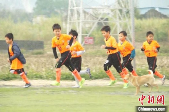 早晨,孩子們在足球場內(nèi)跑步,一隻小黃狗緊緊跟隨。 劉俊聰 攝