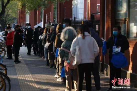 資料圖:公務員考試考場外,工作人員核驗考生信息。 中新社記者 蔣啟明 攝