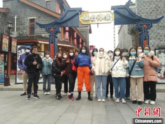 在該街區(qū)游客中心前廣場(chǎng),平安樹、幸福樹等寓意吉祥美好的近50種花卉爭(zhēng)奇斗艷,留學(xué)生們爭(zhēng)相拍照打卡。