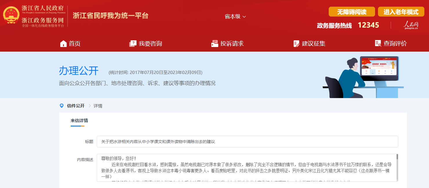 人民網(wǎng)北京2月10日電 (記者孫競(jìng)、李依環(huán))近日,有網(wǎng)民在浙江省政府網(wǎng)站建議“把《水滸》相關(guān)內(nèi)容從中小學(xué)課文和課外讀物中清除出去”。對(duì)此,浙江省教育廳教研室日前作出專門(mén)答復(fù)。