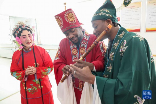 2月17日,在山東省臨沂市蘭山區(qū)棗園鎮(zhèn)弦子戲非遺展廳,外國留學生在了解笛子的發(fā)聲原理。