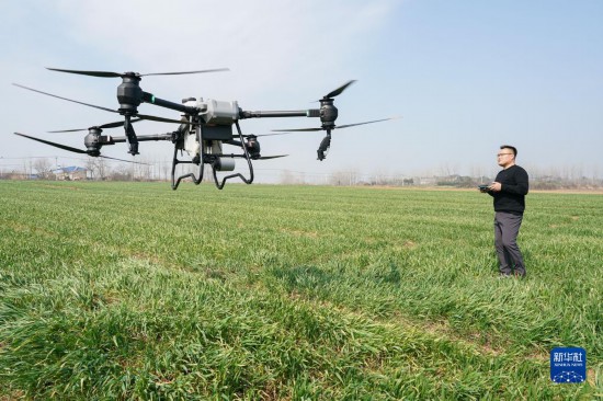 2月28日,王昌在來(lái)安縣水口鎮(zhèn)擁巷村操作植保無(wú)人機(jī)噴灑除草劑。