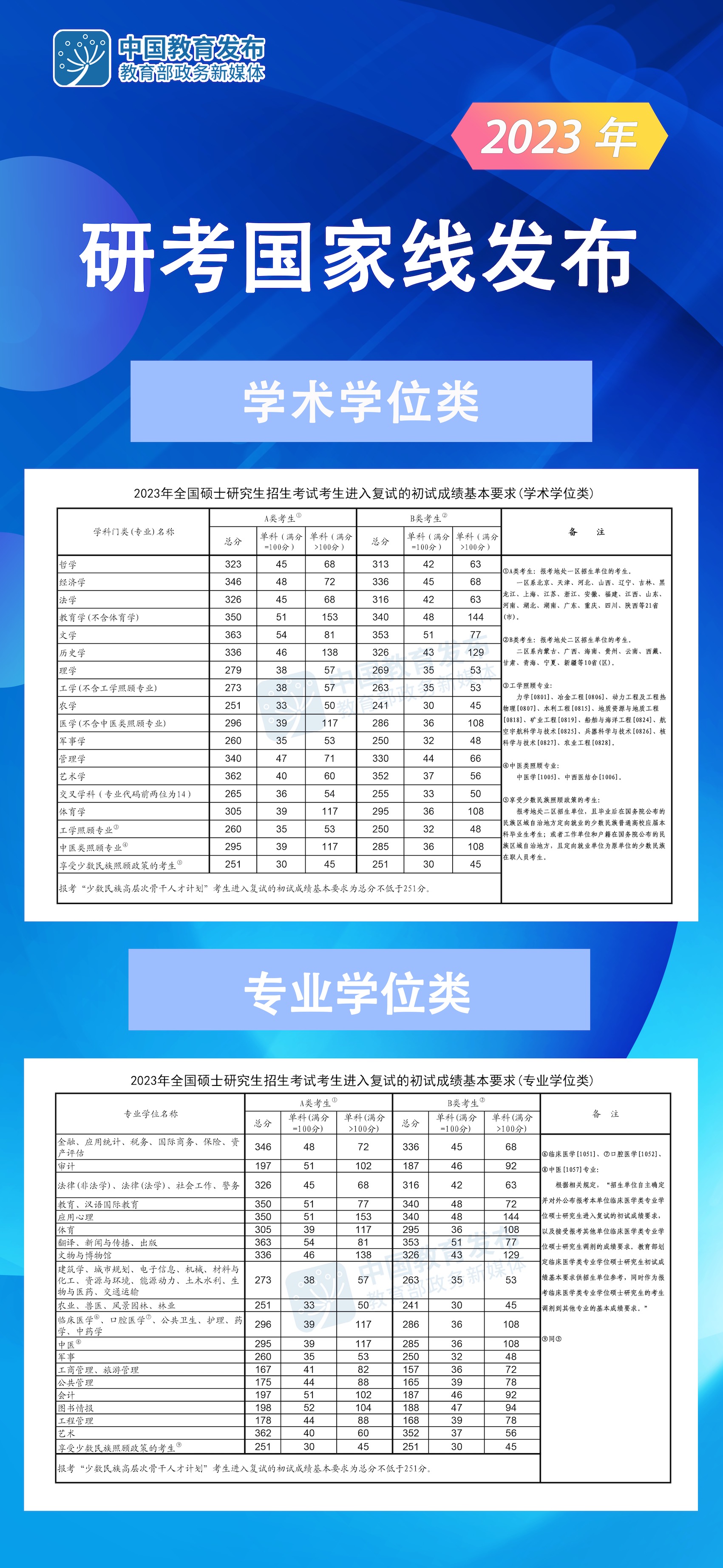 人民網(wǎng)北京3月10日電 (記者李依環(huán))教育部今天正式發(fā)布《2023年全國(guó)碩士研究生招生考試考生進(jìn)入復(fù)試的初試成績(jī)基本要求》(國(guó)家分?jǐn)?shù)線)。根據(jù)《2023年全國(guó)碩士研究生招生工作管理規(guī)定》,各招生單位將在國(guó)家分?jǐn)?shù)線的基礎(chǔ)上,自主確定並公布本單位考生進(jìn)入復(fù)試的初試成績(jī)要求及其他學(xué)術(shù)要求。