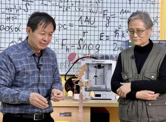 唐守平(左)與另一位退休教師交流科普實驗。(受訪者供圖)