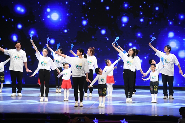 在愛與力量的凝聚下,現(xiàn)場嘉賓上臺為星星的孩子送上祝福並點亮藍燈。在這片藍色的海洋中,在場全體人員共同表達心聲,喊出口號:“手拉手,心連心,我們在一起,一個不能少!”