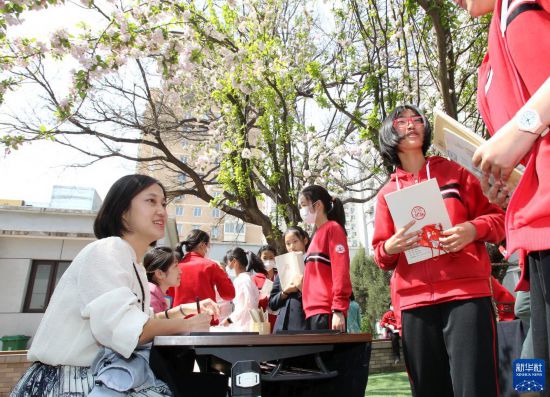 當(dāng)日,北師大實驗華夏女子中學(xué)舉辦以“春和”為主題的第二屆“海棠詩會”。師生們選取有關(guān)“春天”“和煦”“生機”“美好”的詩歌,在校園的海棠樹下賞析吟誦,共享詩歌之美,傳承中華優(yōu)秀傳統(tǒng)文化。
