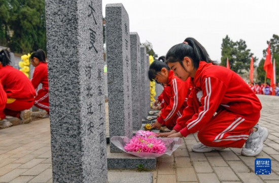4月3日,學(xué)生在河北省遵化市鐵廠鎮(zhèn)甲山烈士陵園獻花。