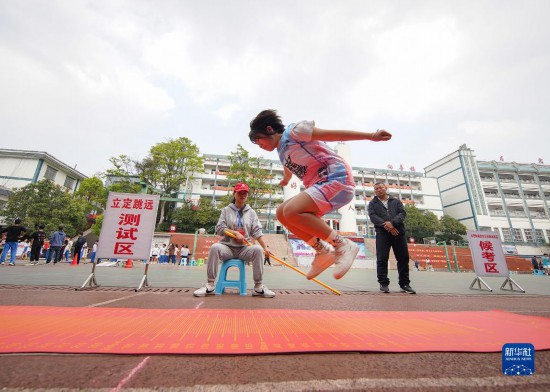 4月13日,在貴州省丹寨縣第三中學(xué),考生參加立定跳遠(yuǎn)項(xiàng)目測試。
