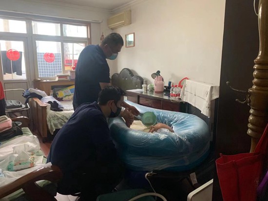 3月11日,助浴團隊在北京察慈小區(qū)為一名101歲的老人提供助浴服務。受訪者提供