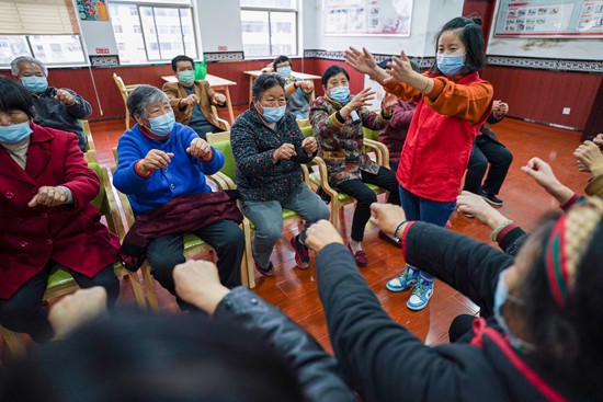 江蘇省鹽城市亭湖區(qū)大洋街道綜合養(yǎng)老服務中心,工作人員在帶領老人練習手指操。新華社記者 李博/攝
