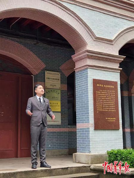 “聽!中山先生在思顏堂演講呢!”“快去,快去!”5月5日的華東政法大學(xué)長寧校區(qū)校園裡,行人很有可能被一群穿著民國學(xué)生裝的年輕人“拉”到孫中山先生1913年2月1日的演講處——華東政法大學(xué)40號樓禮堂門前,一起聆聽110年前的孫中山演講。這裡正在進行的,是華東政法大學(xué)“蘇河明珠”實景思政課,為大家“上課”的是大學(xué)生和思政教師。學(xué)生們在百年歷史建筑前上演了一幕幕經(jīng)典橋段,思政教師則負責(zé)在每一個橋段結(jié)束后串場介紹。