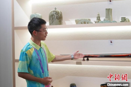 來自浙江外國語學院的“小青荷”王浩杰是媒體村文化屋的一名文化藝術(shù)助理,他主要負責向外國媒體記者介紹中國非遺文化,使其能夠充分感受中國文化的魅力。