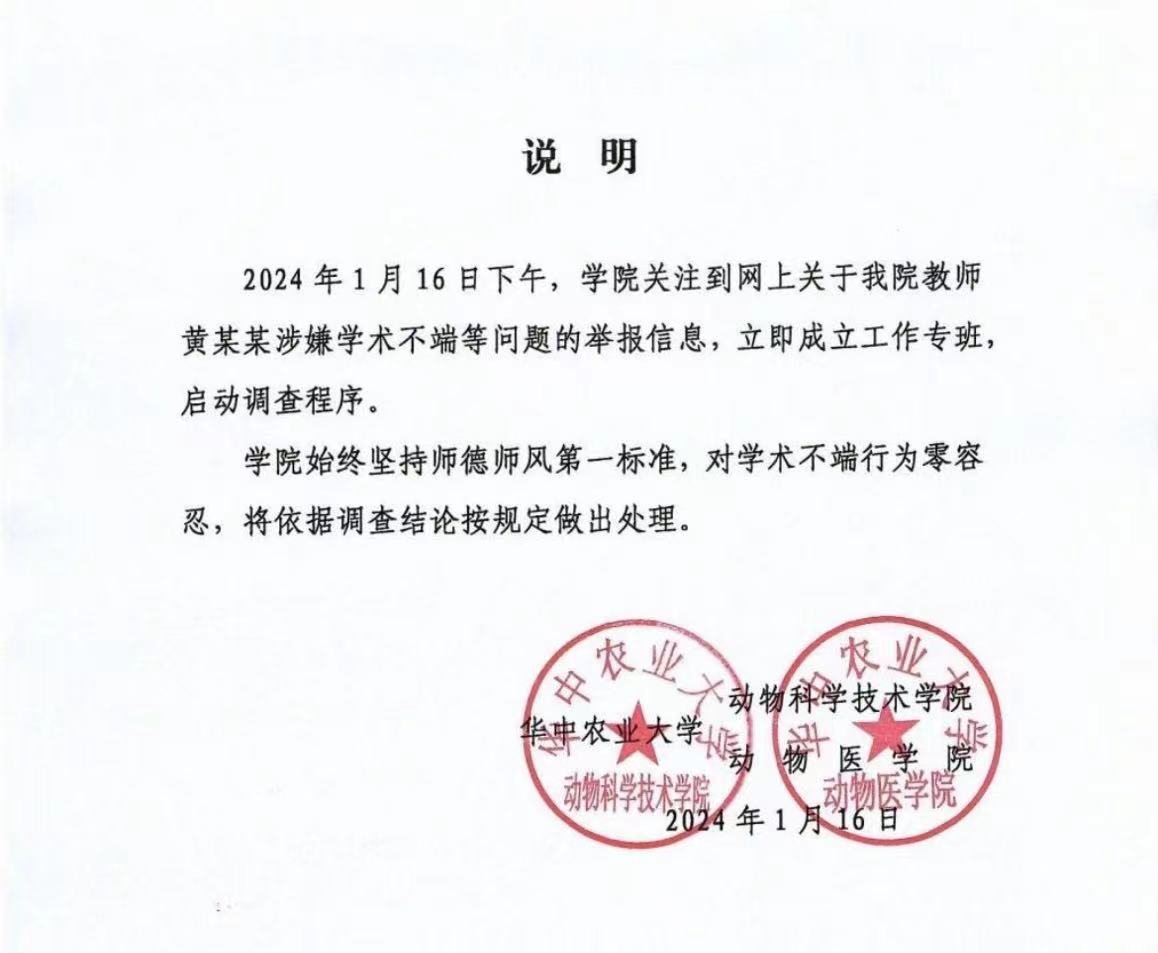 人民網(wǎng)北京1月17日電 (記者李依環(huán))據(jù)華中農(nóng)業(yè)大學(xué)消息,近日,有學(xué)生實名舉報該校某導(dǎo)師學(xué)術(shù)造假。16日晚,該校動物科學(xué)技術(shù)學(xué)院發(fā)布通報稱,學(xué)院關(guān)注到網(wǎng)上關(guān)於教師黃某某涉嫌學(xué)術(shù)不端等問題的舉報信息,立即成立工作專班,啟動調(diào)查程序。