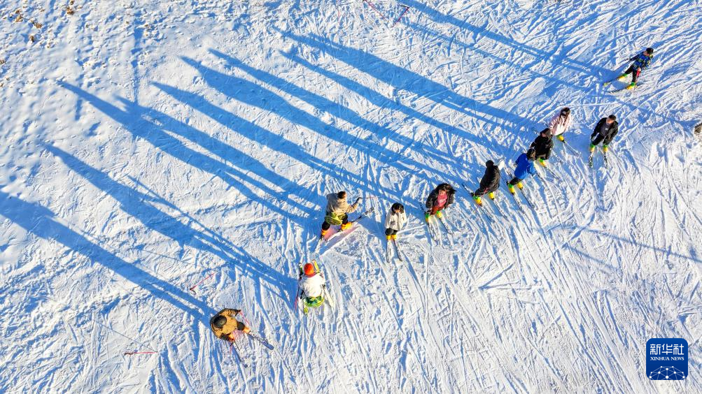 12月22日,游客在河北省遵化市龍山滑雪場滑雪(無人機照片)。
