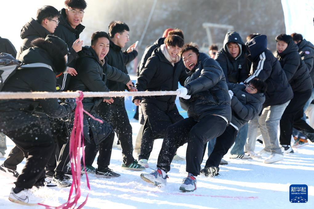 12月21日,在河北省石家莊市鹿泉區(qū)冰雪小鎮(zhèn),大學(xué)生進行雪地拔河比賽。