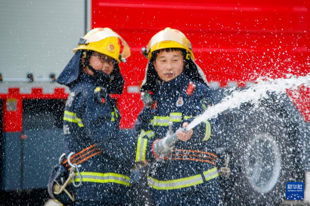 3月31日,在河南省商丘市睢縣鳳翔九年一貫制學校內,小學生(左)在消防員的指導下體驗使用消防水槍。