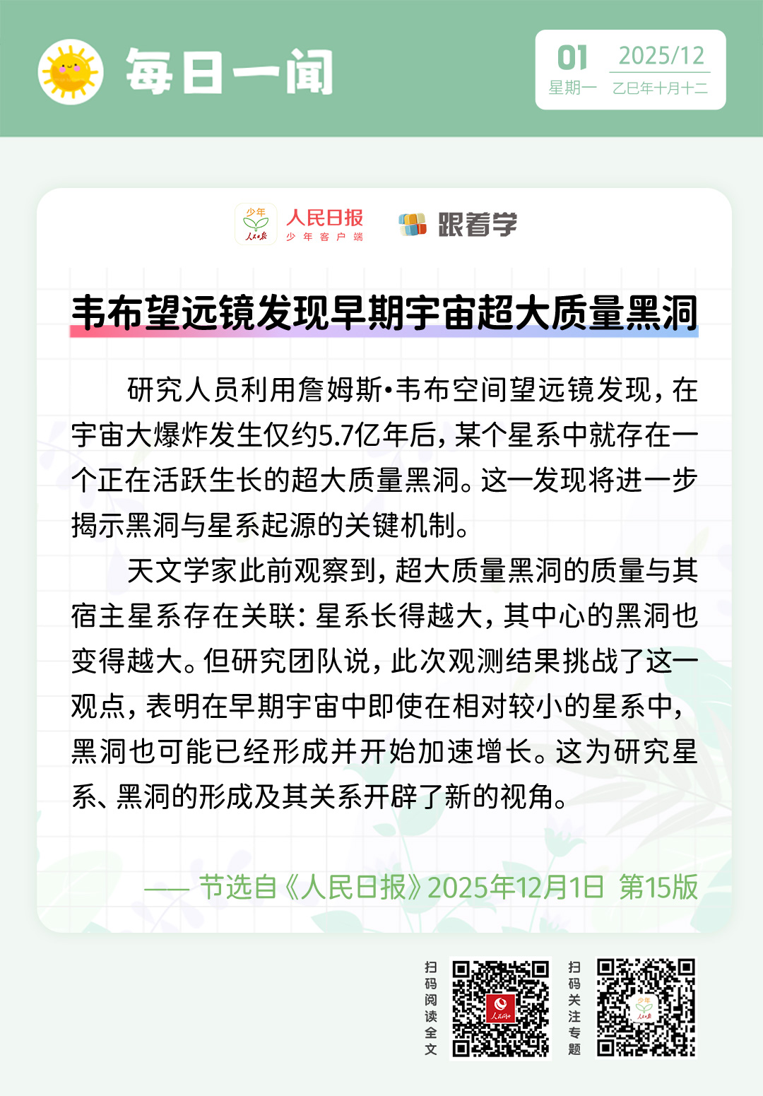 每日一聞丨韋布望遠鏡發(fā)現(xiàn)早期宇宙超大質(zhì)量黑洞