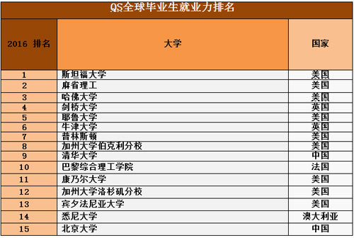 人民網(wǎng)北京11月30日電 (記者 郝孟佳)近日,QS全球教育集團(tuán)正式啟動全新世界大學(xué)排名——QS全球畢業(yè)生就業(yè)力排名。美國名校斯坦福、麻省理工、哈佛大學(xué)畢業(yè)生就業(yè)能力排名全球前三甲。耶魯、普林斯頓和伯克利分列全球第5、7、8名。 排名顯示,英國畢業(yè)生就業(yè)能力最強的是排名劍橋大學(xué)(4)和牛津…[詳細(xì)]