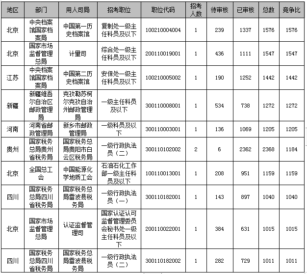 競爭最激烈十大崗位:競爭比最小值為1011:1