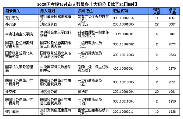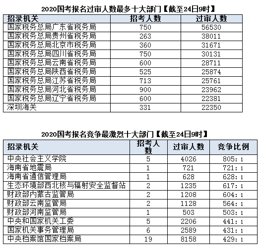 截止到24日9時,已有29個部門報名審核通過人數(shù)過萬,廣東省稅務(wù)局過審人數(shù)56530人位居第一,還有一個過審人數(shù)超三萬的部門是2019國考、2020國考報名期間都比較火熱的國家稅務(wù)總局貴州省稅務(wù)局。