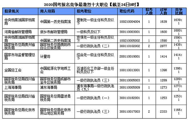 截至10月24日9時,已經(jīng)有20個職位競爭比超越1000:1,位居榜首的依然是中國第一歷史檔案館復(fù)制處一級主任科員及以下100210004004這一職位。河南省郵政管理局新鄉(xiāng)市郵政管理局一級科員及以下300110003001 這一職位排名第二。