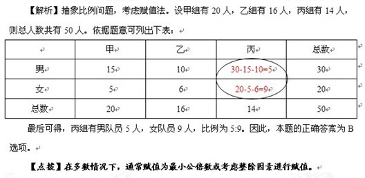 【例5】某調(diào)查隊男女隊員的人數(shù)比是3:2,分為甲乙丙三個調(diào)查小組。已知甲乙丙三組的人數(shù)比是10:8:7,甲組中男女隊員的人數(shù)比是3:1,乙組中男女隊員的人數(shù)比是5:3,則丙組中男女隊員的人數(shù)比是:( )