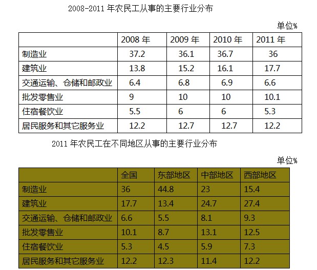 四、2011年全國農(nóng)民工總量達(dá)到25278萬人,比上年增加1055萬人,增長4.4%。農(nóng)民工從業(yè)仍以制造業(yè)、建筑業(yè)和服務(wù)業(yè)為主,從事建筑業(yè)的比重明顯提高。從農(nóng)民工的就業(yè)地區(qū)來看,2011年在東部地區(qū)務(wù)工的農(nóng)民工為16537萬人,比上年增加324萬人。在中部地區(qū)務(wù)工的農(nóng)民工位4438萬人,比上年增加334萬人,增長8.1%。在西部地區(qū)務(wù)工的農(nóng)民工4215萬人,比上年增加370萬人,增長9.6%。