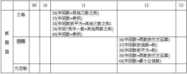新題型分為三角型、圓圈型及九空格型,但從考試情況來(lái)看,九空格型到目前為止沒(méi)有考查過(guò),這種形式在圖形推理中會(huì)考查到,這里不作詳解。