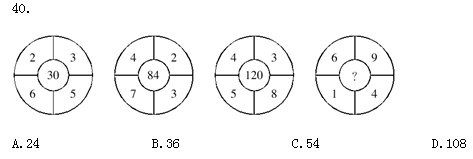 解析:由前三個(gè)圓圈可得,中間數(shù)字是四周四個(gè)數(shù)字的最小公倍數(shù)。第四個(gè)圖中,6、9、1、4的最小公倍數(shù)是36。所以,答案選B。