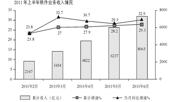 2011年上半年,我國軟件產(chǎn)業(yè)實(shí)現(xiàn)軟件業(yè)務(wù)收入8065億元,同比增長29.3%,增速比去年同期高0.2年百分點(diǎn);實(shí)現(xiàn)利潤103億元,同比增長34.9%。其中,6月份完成軟件業(yè)務(wù)收入1828億元,同比增長32.9%,增速比5月份回升3.6個百分點(diǎn)。
