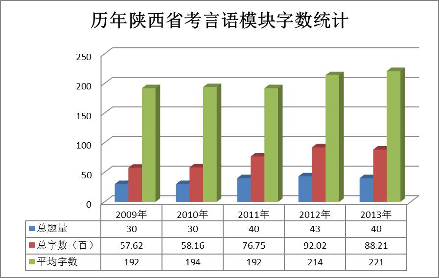 (2)2013年陜西省考言語模塊總字?jǐn)?shù)約8821字,平均每題221字;2014年言語模塊總字?jǐn)?shù)預(yù)計(jì)在9000字左右,平均每題225字,字?jǐn)?shù)約有增加,考生要學(xué)習(xí)一些速讀技巧,并合理安排時(shí)間;